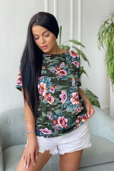 Фото товара 22858, женская зеленая свободная футболка с цветами